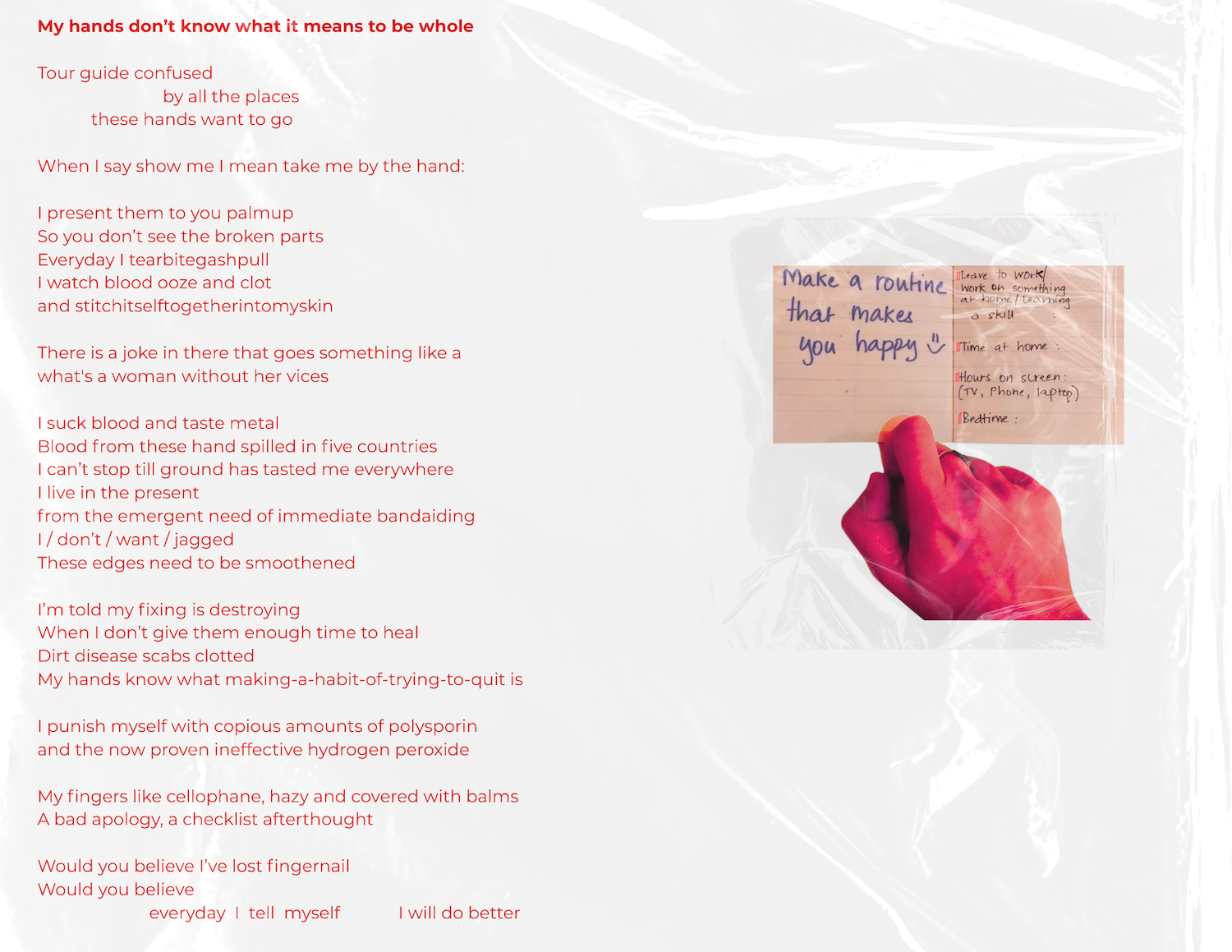I often go through obsessions in my noticing, and they tend to make their way into my poems. This set of poems came from an observation of my hands, my body & their relationship to impermanence. I have been a spoken word poet & a page poet, but experimenting with multi-media & collaborative pieces is a newer entrant in my creative practice, and a most welcome one when words don't feel quite enough.