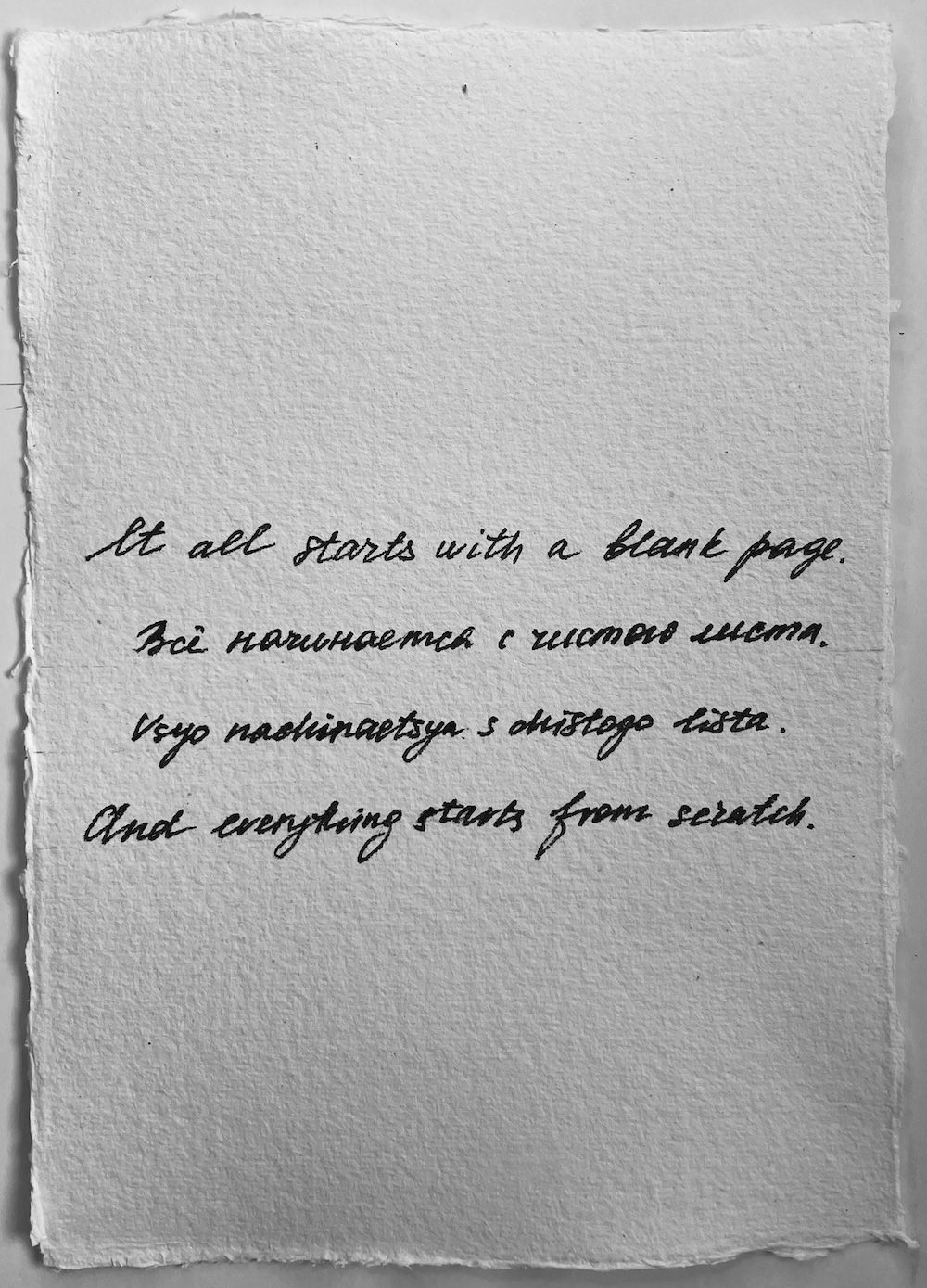Perhaps the strongest inspiration came from not writing anything for a while. Writers and artists do go through periods when everything feels as though it has been put on pause. This is both natural and inevitable; yet the danger appears when you suddenly realise that the pause has lasted far too long, and you want to climb out of that cocoon of unwritten words and unfinished projects. You can feel that ideas are bubbling in your mind, trying to find an escape and take shape. It is important not to miss that moment, and allow yourself at least to do some freewriting, or to return to whatever form you practise. In my case, I began by writing poetry, which is not the genre I feel most comfortable with, yet when I started toying with the ideas of “turning the page” and “starting from a new page”—the poetic form emerged organically. When I moved into the second stage of the project, I began thinking about how I could visualise the notion of creating something anew—and this led me to seek inspiration in language and words themselves, in nature, and in the materials that surround us.